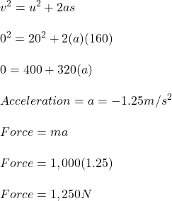 A 1000-kg car is driving toward the north along a straight horizontal road at a speed of 20.0 m/s. The driver applies the brakes and the car comes to a rest uniformly in a distance of 160 m. What are the magnitude and direction of the net force applied to the car to bring it to rest?