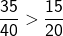 \therefore\mathrm{\dfrac{35}{40}  >  \dfrac{15}{20} }