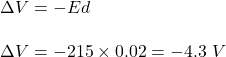 5. A charge moves a distance of 2.0 cm in the direction of a uniform electric field having a magnitude of 215 N/C. The electrical potential