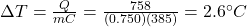 \Delta T=\frac{Q}{mC}=\frac{758}{(0.750)(385)}=2.6^{\circ}C