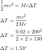 \dfrac{1}{2}mv^2=Mc\Delta T\\\\\Delta T=\dfrac{mv^2}{2Mc}\\\\\Delta T=\dfrac{0.02\times 200^2}{2\times 2\times 130}\\\\\Delta T=1.53^{\circ}