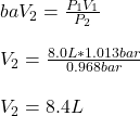 A balloon is inflated to a volume of 8.0 L on a day when the atmospheric pressure is 1.013 bar . The next day, a storm front arrives, and the atmospheric pressure drops to 0.968 bar . Assuming the temperature remains constant, what is the new volume of the balloon, in liters