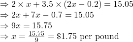 A chili recipe calls for 2 pounds of ground pork and 3.5 pounds of ground beef. The cost of ground beef per pound is $0.20 less than twice the cost of ground pork. If the total cost of meat for the recipe is $15.05, what is the cost per pound of ground pork?