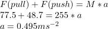 F(pull) + F (push) = M * a\\77.5 + 48.7 = 255*a\\a = 0.495ms^{-2}