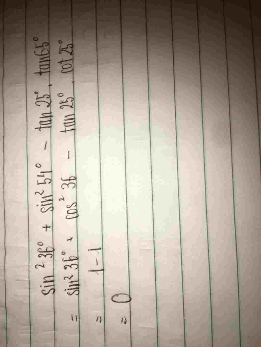A= sin^2 36 +sin^2 54 – tan 25. tan 65 nhờ mng giúp em, em cảm ơn ạ