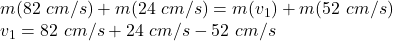 Abbey and Mia are in the basement playing pool. On Abbey’s recent shot, the cue ball was moving east at 82 cm/s when it struck the slower 5-ball moving in the same direction at 24 cm/s. The 5-ball immediately speeds up to 52 cm/s. Determine the post-collision speed of the cue ball.