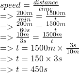 speed =  \frac{distance}{time}  \\   =  > \frac{200m}{min}  =  \frac{1500m}{t}  \\  =  >  \frac{200m}{60s}  = \frac{1500m}{t} \\  =  >  \frac{10m}{3s}  = \frac{1500m}{t} \\  =  > t = 1500m \times  \frac{3s}{10m}  \\  =  > t = 150 \times 3s \\  =  > t = 450s \: