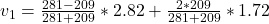 So if we consider the car A is having a mass m1 which is equal to 281 mc kg with initial velocity before collision as u1 = 2.82 m/s. And then the car B will be having the mass m2 equal to 209 mc kg with the velocity of 1.72 m/s. So if the final velocity of car A after collision is required to determine then we have to solve the formula for v1