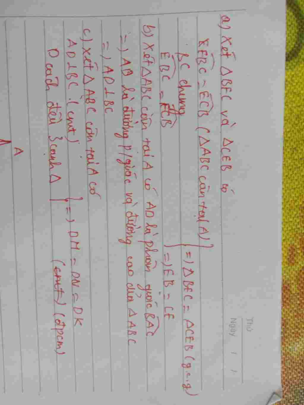 Cho ΔABC cân tại A vẽ các tia phân giác BE;CF của góc B và góc C ( E∈AC; F∈AB) a, Chứng minh BE=CF b, Gọi D là giao điểm của BE và CF. Chứng minh AD