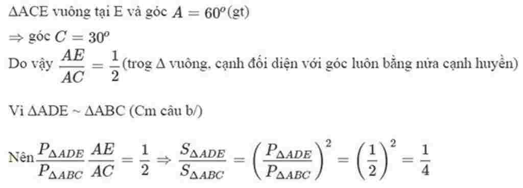 Cho ΔABC nhọn, A=60 độ, BD CE là đường cao. C/M $S_{ADE}=$ $\frac{1}{4}$ $S_{ABC}$