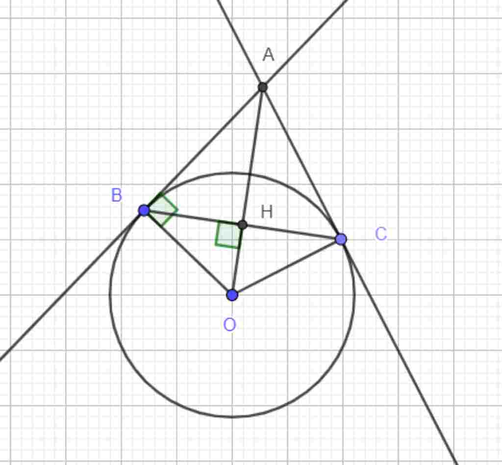 Mà $AB$, $AC$ là tiếp tuyến từ $A$ của $(O;R)$ nên $AB=AC$ do đó $A$ cũng nằm trên trung trực của $BC$