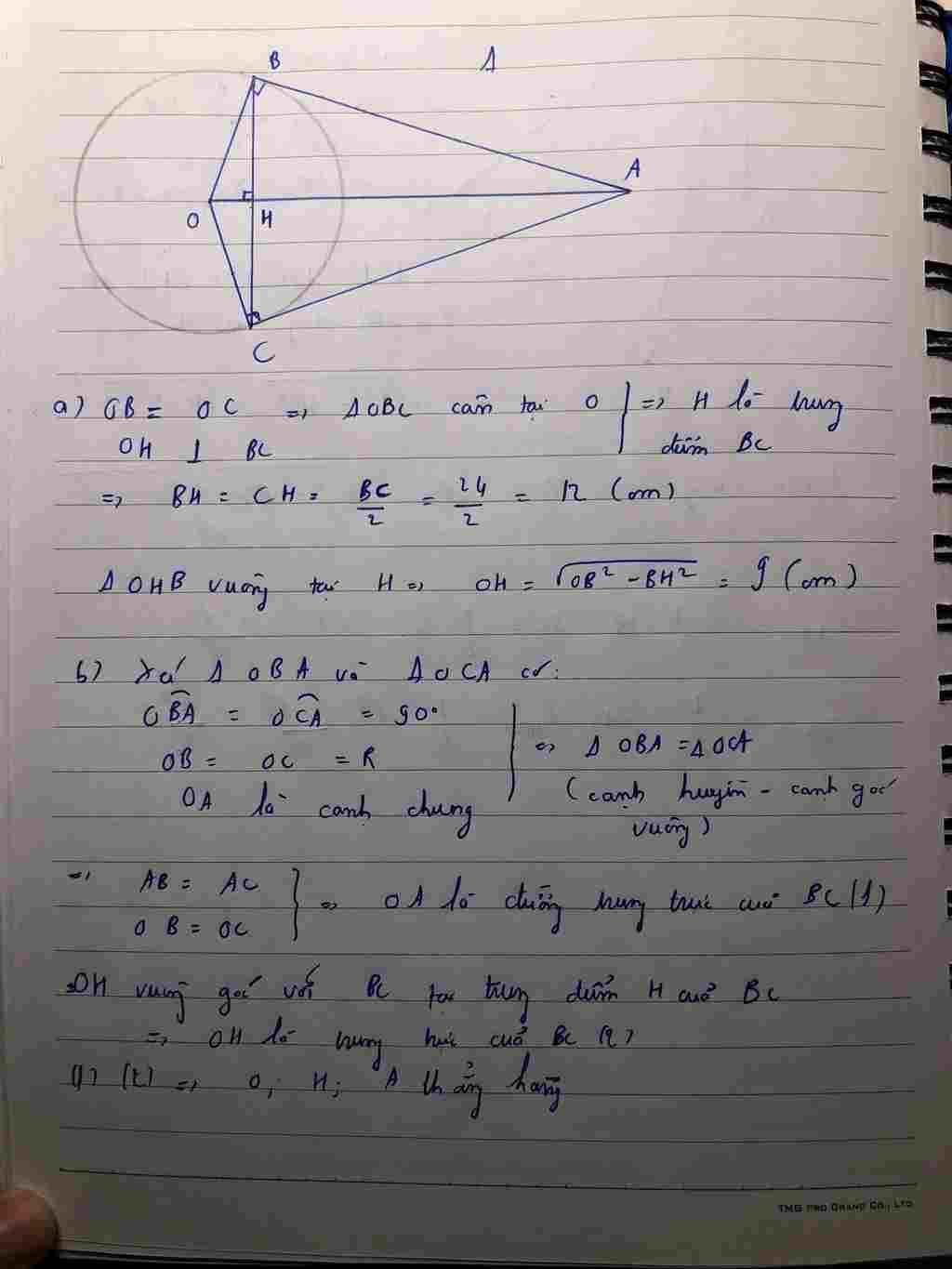 b, $OH$ là đường cao trong $\Delta$ cân $OBC$ hay $OH$ là trung trực của $BC$