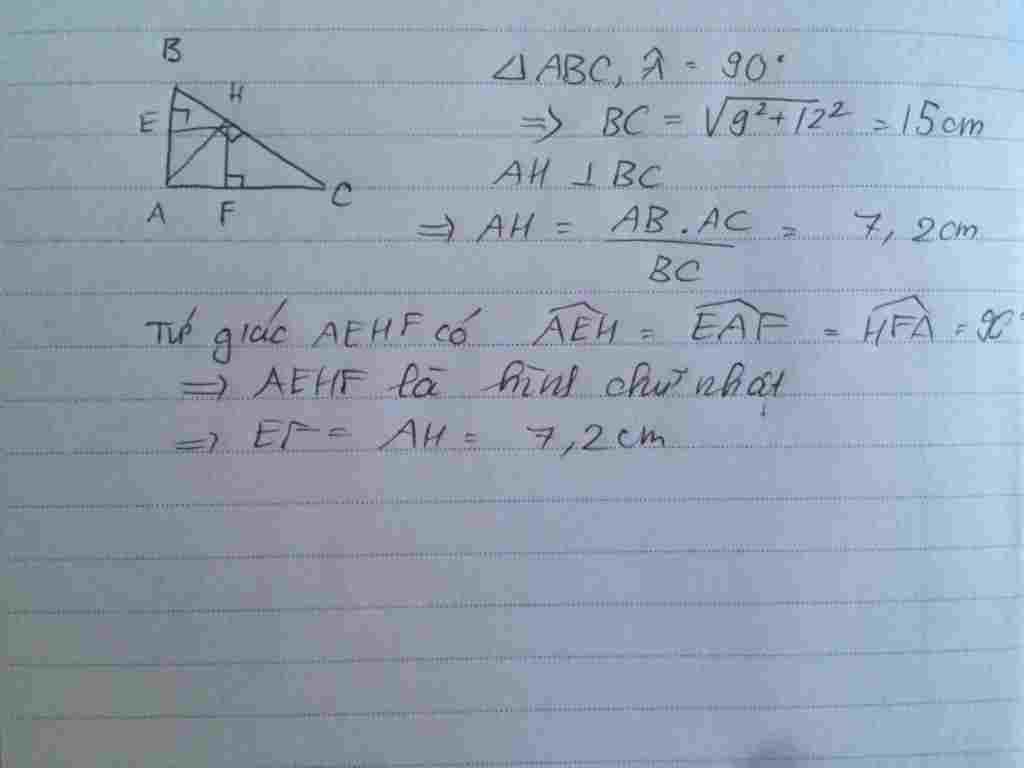 Cho tam giác abc vuông tại a có ab=9cm ac = 12 cm.Kẻ he và hf lần lượt vuông góc với ab và ac. Tính Ef