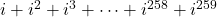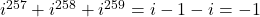 So, the sum to i^256 is zero, and i^257 +i^259 = 0. The value of the sum is then i^258 = i^(258 mod 4) = i^2 = -1