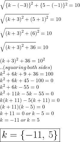 Find k so that the distance from (–3, –1) to (k, 5) is 10 units.