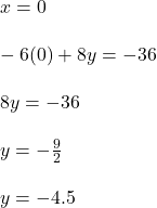 Find the x- and y- intercepts of the line with the given equation -6x+8y=-36