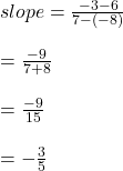 Find the slope of the line that goes through the points (-8,6) and (7,-3). -3/5 -5/3 -1/3 1/3