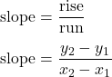 The change in x is equal to the difference in x-coordinates (also called run), and the change in y is equal to the difference in y-coordinates (also called rise). y₂ − y₁