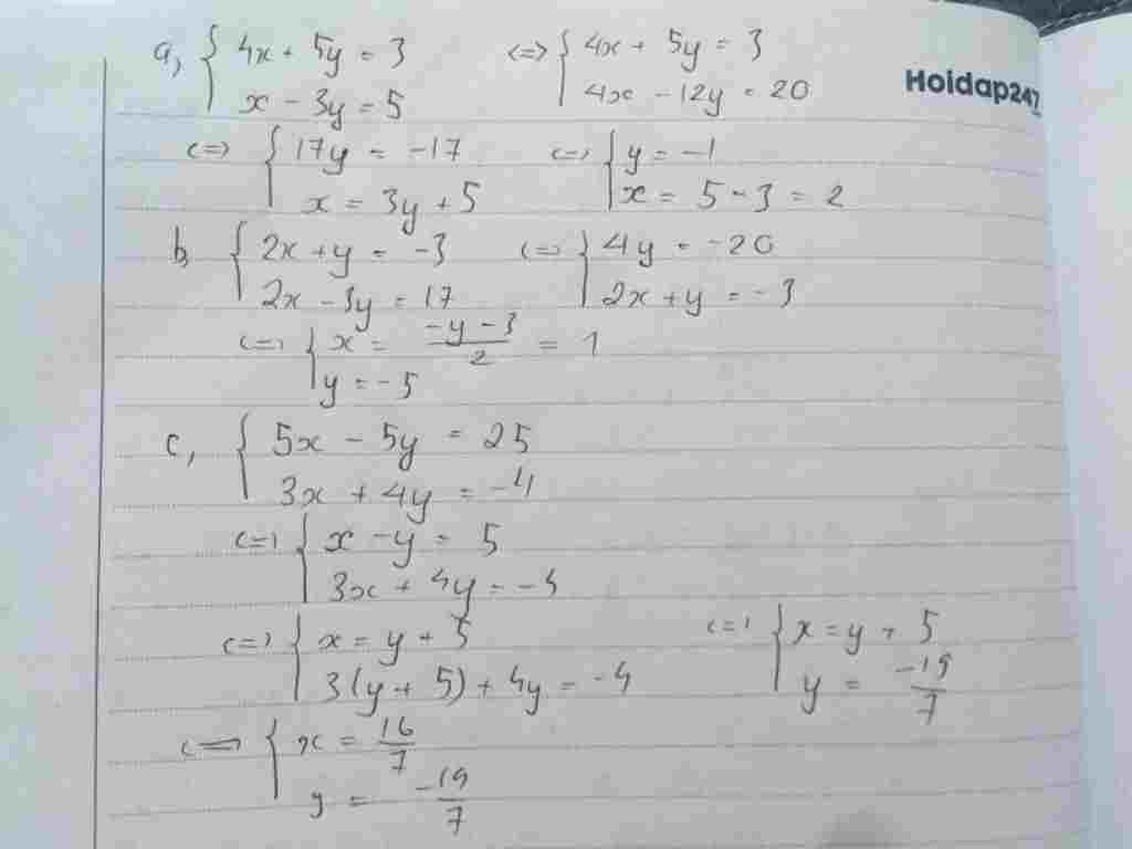 $c$) $\left\{\begin{matrix}5x-5y=25& \\3x+4y=-4&\end{matrix}\right.$