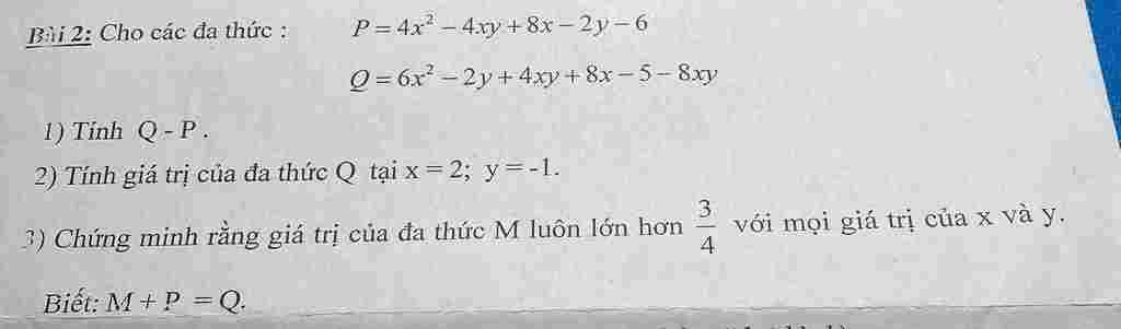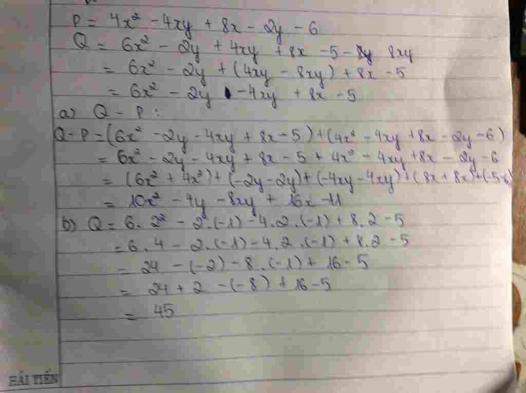 1) P-Q=( 4x^2-4xy+8x-2y)-(6x^2-2y+4xy+8x-5-8xy)