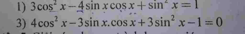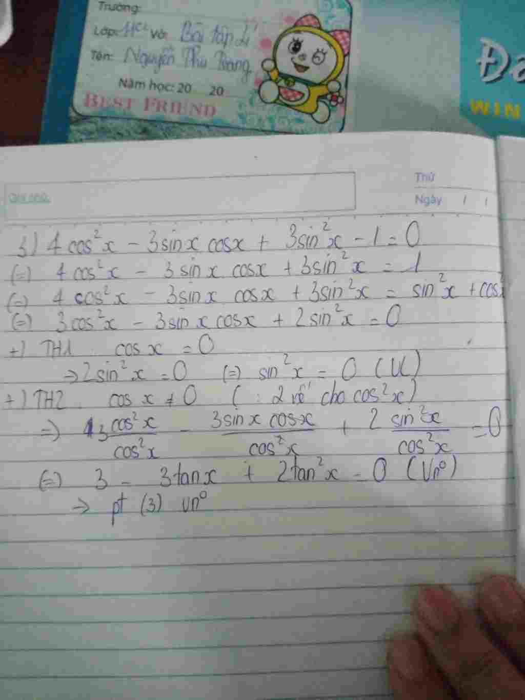 $\begin{array}{l}4\cos^2x – 3\sin x\cos x + 3\sin^2x – 1 = 0\\ \text{Nhận thấy $\cos x = 0$ không là nghiệm của phương trình}\\ \text{Chia 2 vế của phương trình cho $\cos^2x$ ta được:}\\ 4 – 3\tan x + 3\tan^2x – \dfrac{1}{\cos^2x} = 0\\ \Leftrightarrow 3\tan^2x – (\tan^2x + 1) – 3\tan x + 4 = 0\\ \Leftrightarrow 2\tan^2x – 3\tan x + 3 = 0 \quad \text{(vô nghiệm)}\\ \text{Vậy phương trình đã cho vô nghiệm}\end{array}$