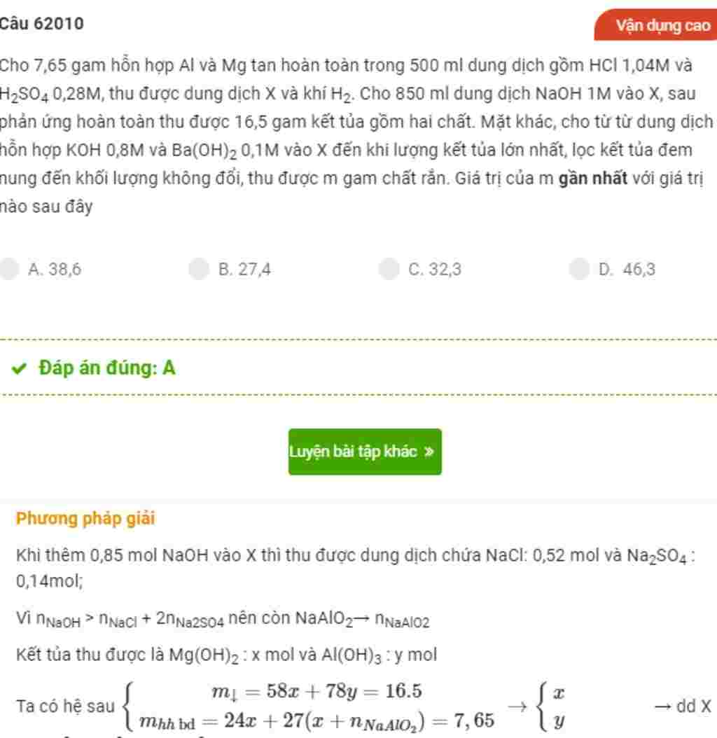 \({n_{Al}} = {n_{Al{{(OH)}_3}}} + {n_{NaAl{O_2}}} = y + {n_{NaAl{O_2}}} \to 24x + 27(y + {n_{NaAl{O_2}}}) = 7,65\)