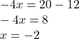 Gwendolyn is asked to solve the equation –4(x – 3) = 20. She shows the work below and states that the solution is x = –8. –4(x – 3) = 20 –4x + 12 = 20 –4x = 32 x = –8 Unfortunately, Gwendolyn’s work is flawed. Explain the flaw in Gwendolyn’s work. Determine the correct solution to the equation.