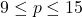9\leq p\leq 15