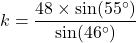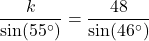 In ΔKLM, l = 48 inches, ∠K=55° and ∠L=46°. Find the length of k, to the nearest inch.\