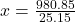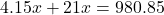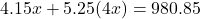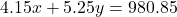 Substituting y=4x in 4.15x+5.25y=980.85, we get
