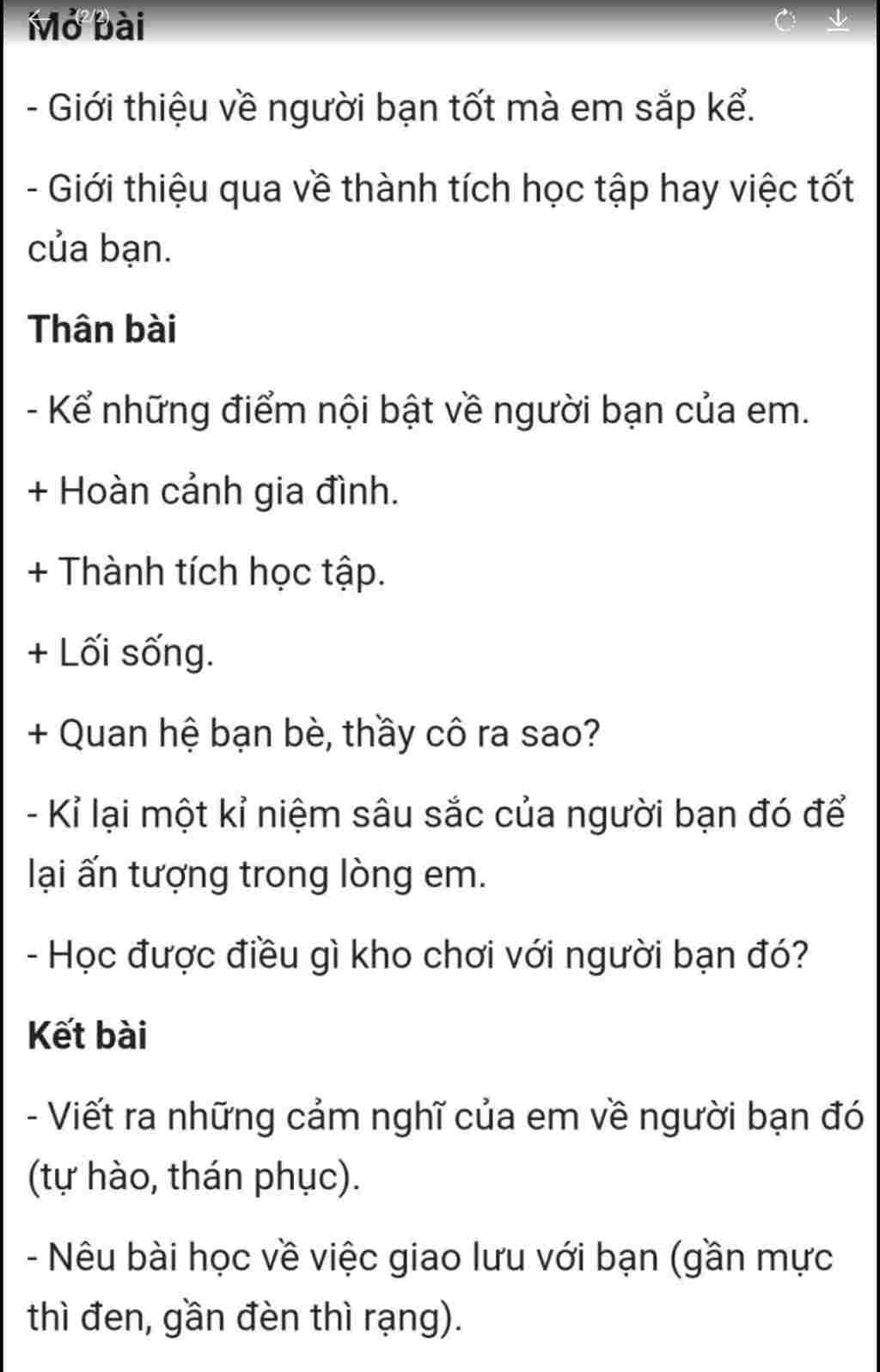 – Tóm tắt qua: Ví dụ: Gần nhà em có bạn Lan dù hoàn cảnh khó khăn nhưng vẫn luôn đạt được thành tích tốt trên trường. Lan làm em khâm phục về tinh thần học tập vượt khó, không quản khó khăn của bạn.