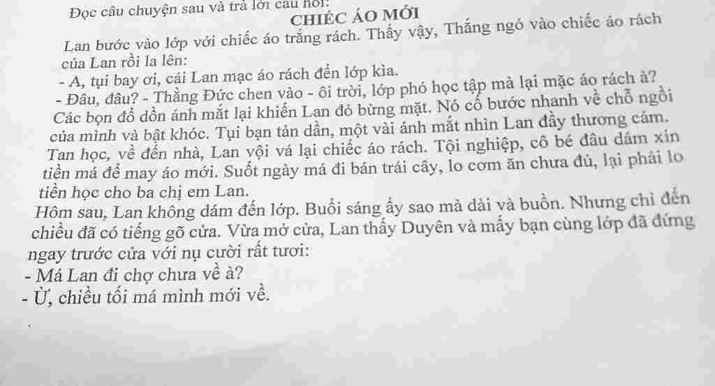 Câu chuyện được kết thúc rất cảm động . Lan mở bức thư ra và đọc được những dòng chữ cô giáo viết cho Lan cùng với món quà là chiếc áo trắng tinh . Chắc hẳn Lan sẽ cảm động lắm .