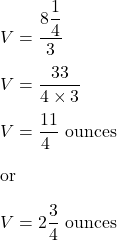 Mr. Cooper has 8 1/4 ounces of a chemical solution. He will put an equal amount of the solution into 3 test tubes. How much solution will be in each test tube?