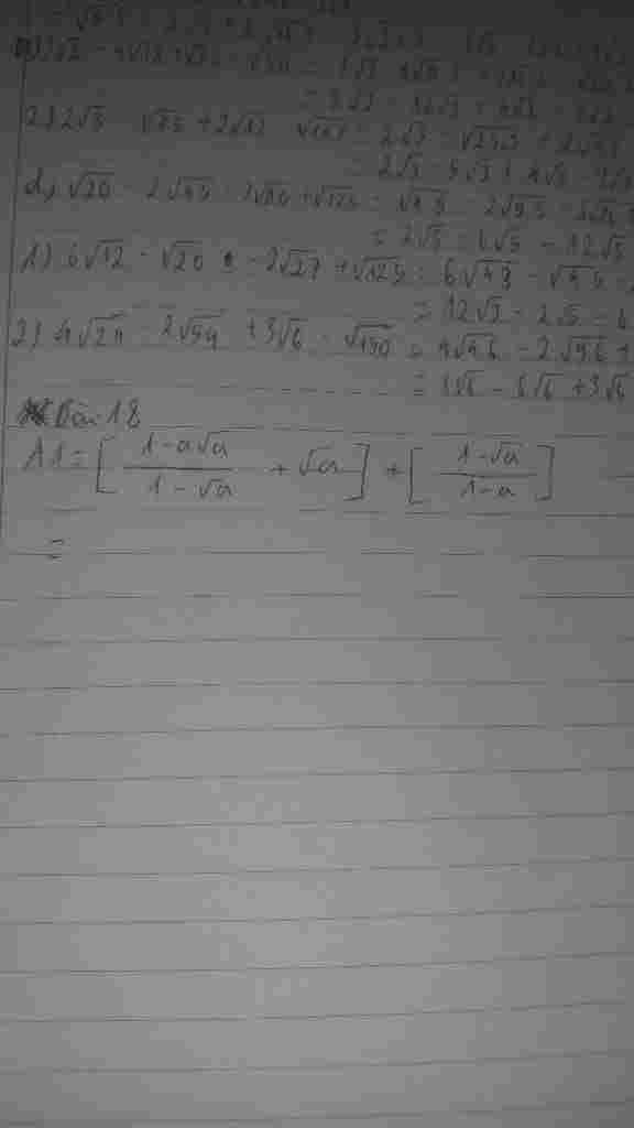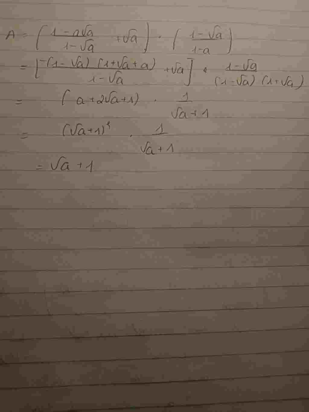 A = \left[ {\dfrac{{\left( {1 – \sqrt a } \right)\left( {1 + \sqrt a + a} \right)}}{{1 – \sqrt a }} + \sqrt a } \right].\left[ {\dfrac{{1 – \sqrt a }}{{\left( {1 – \sqrt a } \right)\left( {1 + \sqrt a } \right)}}} \right]\\