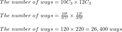 Suppose that a department contains 10 men and 12 women. How many ways are there to form a committee with six members if it must have the same number of men and women