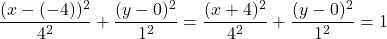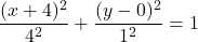 The center of an ellipse is (-4,0) one vertex is (-8,0) and one co-vertex is (-4,1). Write the equation of the ellipse