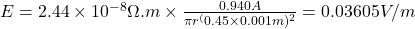 the resistivity of gold is 2.44×10−8Ω⋅m at room temperature. A gold wire that is 0.9 mm in diameter and 14 cm long carries a current of 940