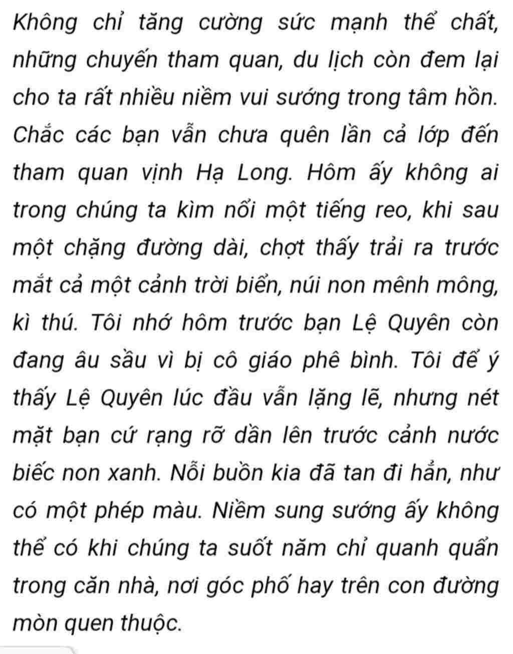 không chỉ tăng cường sức mạnh thể chất ,những chuyến tham quan du lịch còn đem lại cho ta rất nhiều niềm vui sướng trong tâm hồn.Sung sướng biết bao,bồi hồi biết bao khi nhớ có lần cả lớp đến tham quan vịnh Hạ Long.Lần ấy ,không ai trong chúng ta kìm nổi một tiếng reo, khi sau một chặng đường dài mệt mỏi,chợt thấy trải ra trước mắt cả một cảnh trời biển,nước non mênh mông vô tận,kì thú.Tôi nhớ hôm trước có bạn Lệ Quyên còn đang âu sầu vì bị cô giáo phê bình.Tôi để ý thấy Lệ Quyên lúc đầu vẫn lặng lẽ ,nhưng nét mặt bạn ấy cũng rạng rỡ dần lên trước cảnh nước biếc non xanh.Nỗi buồn kia đã tan đi hẳn như có một phép màu thần thông tuyệt diệu!Chính tôi còn phải cảm thấy rung động trước một vẻ đẹp diệu kỳ như vậy !niềm sung sướng thấy không chỉ có khi chúng ta suốt năm chỉ quanh quẩn nơi trong căn nhà bé, nhà góc phố nhỏ hay trên con đường mòn quen thuộc mà ta đã đi lại lắm lần.