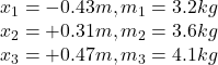 Three masses are placed along the x-axis: m1 = 3.2 kg is a distance x1 = 0.43 m to the left of the origin, m2 = 3.6 kg is a distance x2 = 0.