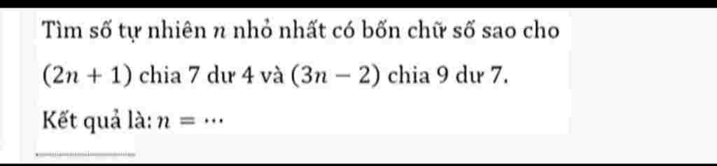 Tìm số tự nhiên n nhỏ nhất có bốn chữ số sao cho (2n + 1) chia 7 dư 4 và (3n – 2) chia 9 dư 7. Kết quả là: n = . Giải chi tiết giúp em với….