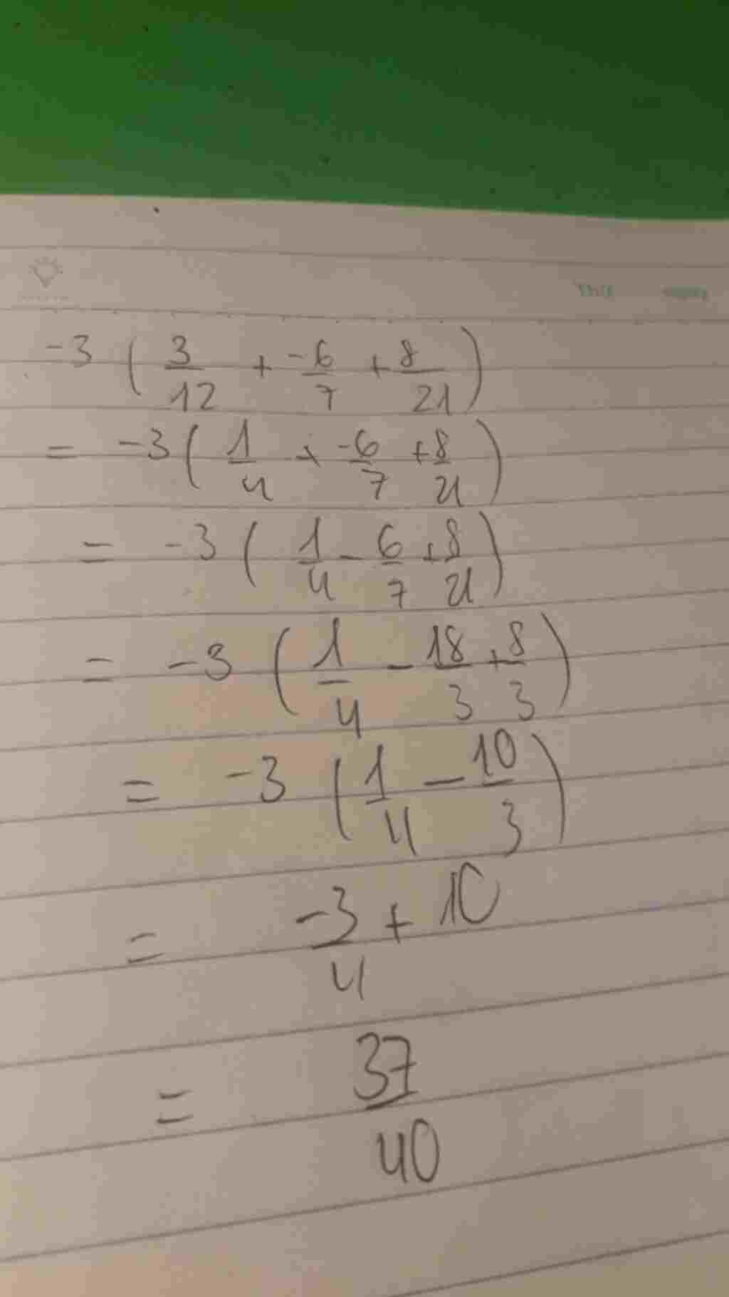 `=-3 . 3/12 + 3 . 6/7 +(-3). 8/21`