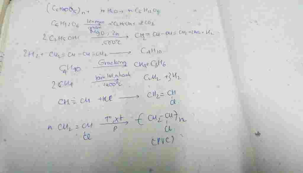 Tinh bột -> glucozo -> etnol -> buta-1,3-đien -> butan-> metan -> vinylclorua -> PVC