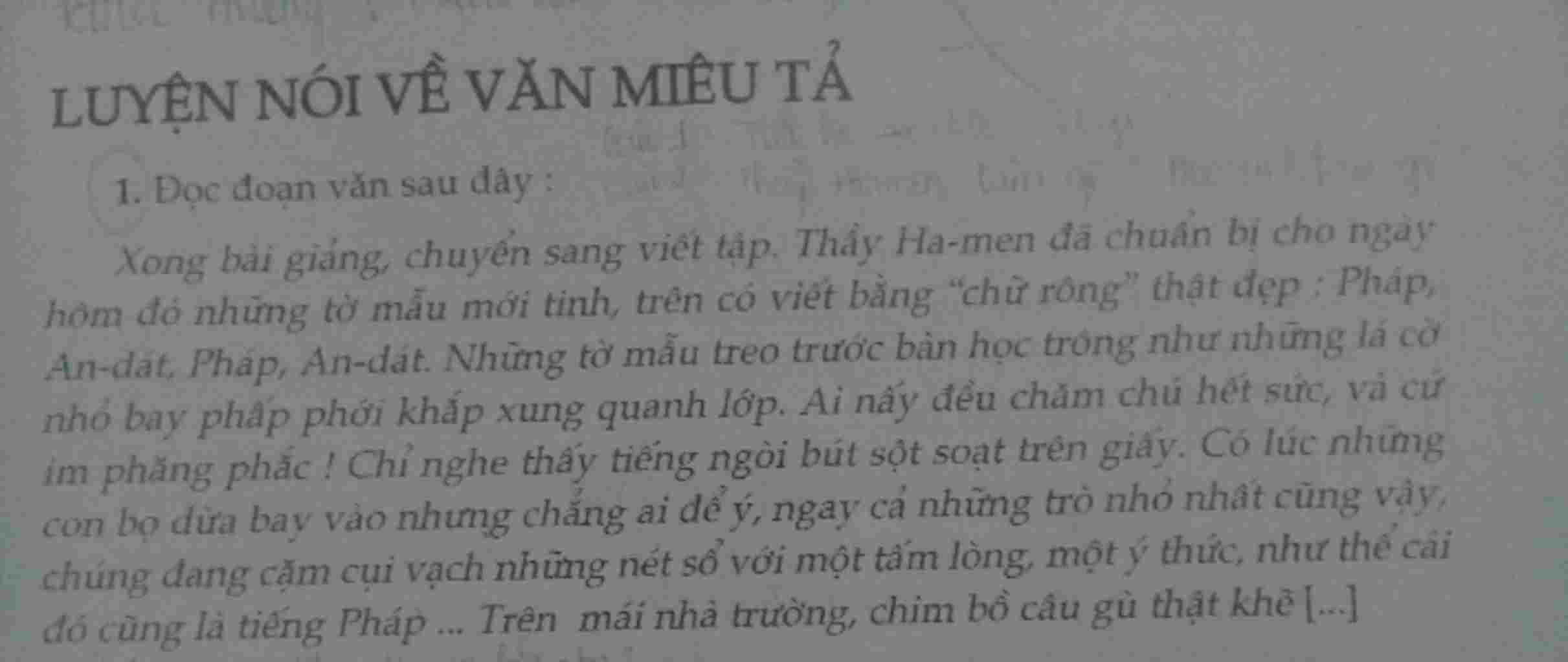 Trả lời câu hỏi sau 1/ Tiết học có gì đặc biệt? 2/ Thầy Hamen làm gì? Học sinh làm gì? 3/ Không khí trong lớp như thế nào? 4/ Âm thanh, tiếng nào đáng