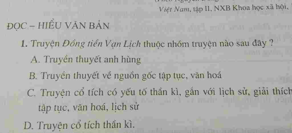 Việt Nam, tập II, NXB Khoa học xã hội, ĐỌC – HIỂU VĂN BẢN 1. Truyện Đồng tiền Vạn Lịch thuộc nhóm truyện nào sau đây ? A. Truyền thuyết anh hùng B. Tr