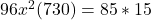 What are the solutions to 96x(730) = (85/x)(15) in decimal form?