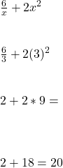 The value of Start Fraction 6 Over x End Fraction + 2×2, when x = 3 is 20.