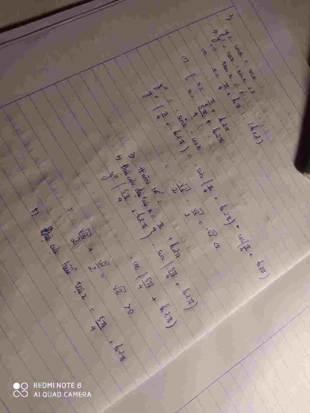 $\eqalign{ & y = \sin x + \cos x \cr & y’ = \cos x – \sin x = 0 \cr & \Leftrightarrow \tan x = 1 \Leftrightarrow x = {\pi \over 4} + k\pi \,\,\left( {k \in Z} \right) \cr & \Leftrightarrow \left[ \matrix{ x = {\pi \over 4} + k2\pi \hfill \cr x = {{5\pi } \over 4} + k2\pi \hfill \cr} \right. \cr & y” = – \sin x – \cos x \cr & y”\left( {{\pi \over 4} + k2\pi } \right) = – \sin \left( {{\pi \over 4} + k2\pi } \right) – \cos \left( {{\pi \over 4} + k2\pi } \right) \cr & = – {{\sqrt 2 } \over 2} – {{\sqrt 2 } \over 2} = – \sqrt 2 < 0 \cr & \Rightarrow \text{Hàm số đạt cực đại tại }x = {\pi \over 4} + k2\pi \cr & y”\left( {{{5\pi } \over 4} + k2\pi } \right) – \sin \left( {{{5\pi } \over 4} + k2\pi } \right) – \cos \left( {{{5\pi } \over 4} + k2\pi } \right) \cr & = {{\sqrt 2 } \over 2} + {{\sqrt 2 } \over 2} = \sqrt 2 > 0 \cr & \Rightarrow \text{Hàm số đạt cực tiểu tại }x = {{5\pi } \over 4} + k2\pi \cr} $